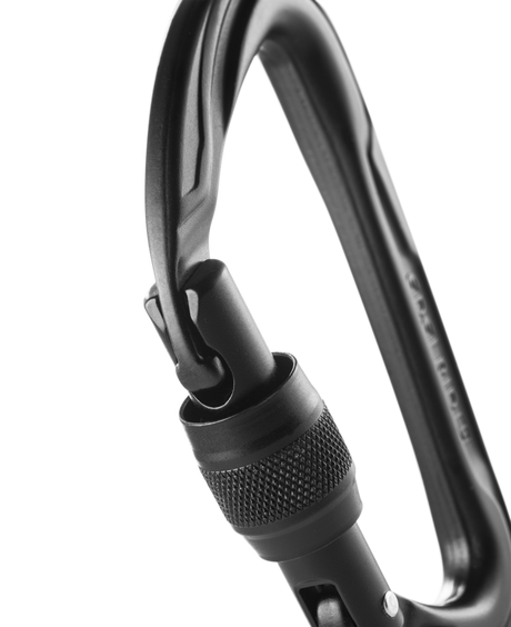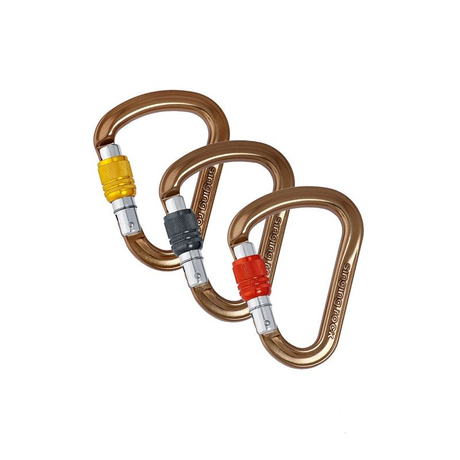 Bei Arbeiten mit hoher Vibration ist das Verwenden von Schraubkarabinern nicht zu empfehlen, da sich der Schraubverschluss eigenständig Öffnen kann.