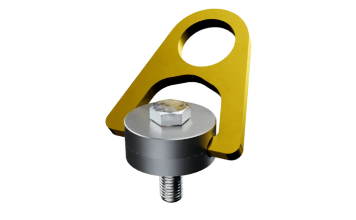 Der robuste ABS-Lock 360 besteht aus einem zweiteiligen Grundkörper mit einem Durchmesser von 50 mm und zwei seitlichen Bohrungen zur sicheren Befestigung der Anschlagöse. Diese Konstruktion ermöglicht eine Belastung in alle Richtungen bei höchster Anwender-Flexibilität. Die Anschlagöse ist Signal-Gelb (RAL 1003).