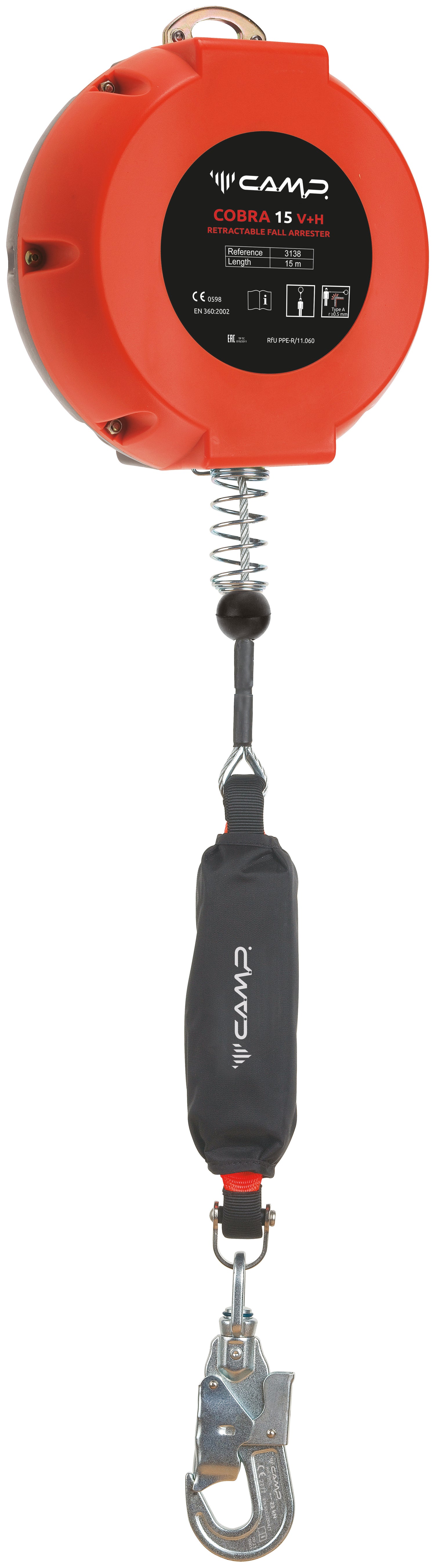 Dieses Höhensicherungsgerät - Cobra 15 - Absturzsicherung von Camp, verfügt über eine Rückholvorrichtung, eine Falldämpfer und einen drehbaren Karabiner. Es ist für horizontale/schräge Verwendung dank des externen Falldämfers zertifiziert. Die Seillänge der Absturzsicherung beträgt 15 m.