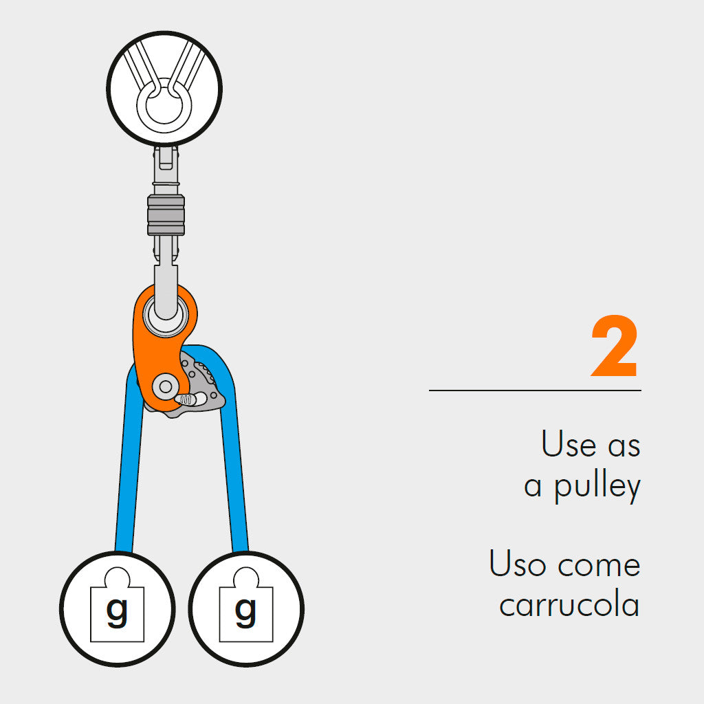 Durch eine gefederte Klemme lässt sich die RollnLock als leichte Aufstiegsklemme verwenden. Ebenso als Umlenkrolle mit Rücklaufsperre für das Nachziehen von Materialsäcken etc.