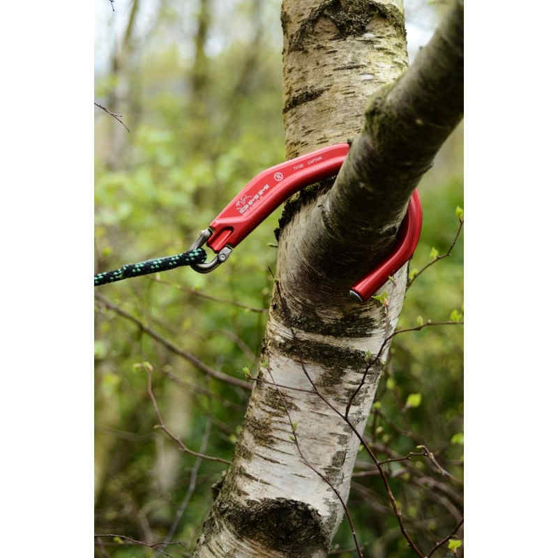 Wurfhaken Captain von DMM im praktischen Set mit 15 m Seil und Tasche. Ob beim überstieg in den Nachbarbaum oder zum kontrollierten Traversieren, der DMM Captain macht die Bewegung im Baum noch einfacher. Durch sein gut durchdachtes, rindenfreundliches Design garantiert er Stabilität im Baum und erlaubt verschiedene Arbeitspositionen. Dank des schwenkbaren, textilfreundlichen D-Schäkels, dem austauschbaren Nasengewicht und der ausgeklügelten Form richtet sich der Captain selbst aus und bleibt auch in weiter entfernten Ankerpunkten oder schwierigen Astgabeln hängen. Dadurch wird ein ein kontrolliertes Traversieren möglich. Zwar ist der Wurfhaken relativ schwer, fliegt dafür aber auch besser. Das Nasengewicht ist austauschbar, so lässt sich der Haken für verschieden Techniken anpassen. Zum Transport nach der Nutzung kann der Haken mit der oberen öse und dem bereits montierten XSRE Karabinern einfach mit der öffnung nach unten am Gurt befestigt werden. Dadurch wird ein lästiges Verfangen in ästen vermindert. Die hohe Nennfestigkeit von 18 kN wird durch die besondere Konstruktion und die Verwendung von hochwertigen Materialien erreicht. Wie von DMM gewohnt sind alle Kanten gerundet und sorgt so für eine Schonung von Seilen und der Rinde. Der maximale Ankerdurchmesser beträgt 90 mm. Features