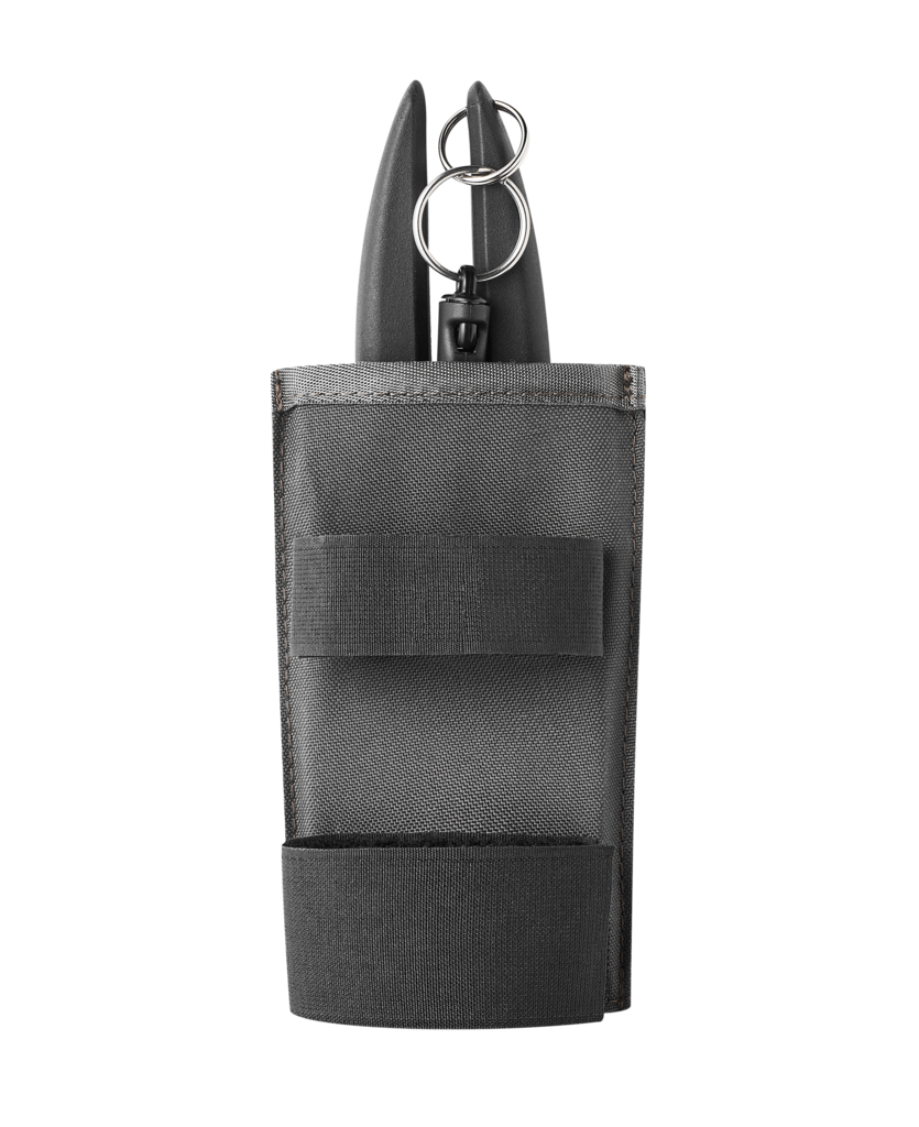 Clip Scissors, die Schere mit Schutzsicherung, die vor Gebrauch entriegelt werden muss. Zum Durchtrennen von Seilen und Bändern. Mit Holster zum Anbringen am Gurt und mit Gummischnur fixiert.