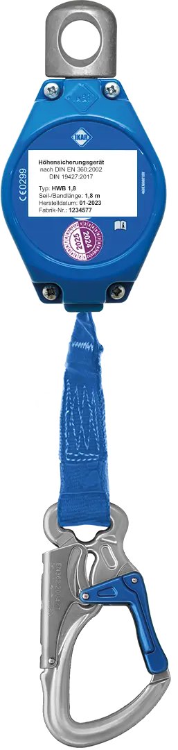 Dieses widerstandsfähige und wartungsarme Höhensicherungsgerät ACB 1,8 mit Drehwirbel ist für Personen in Hubarbeitsbühnen und Arbeitskörben entwickelt. Das Aluminiumgehäuse ist robust und seewasserbeständig. Das Verbindungsmittel besteht aus besonders robustem Dyneema®-Band. IKAR Höhensicherungsgeräte haben erfolgreich die horizontalen Einsatzprüfungen CNB/P/11.060 (r = ≥ 0,5 mm) bestanden.