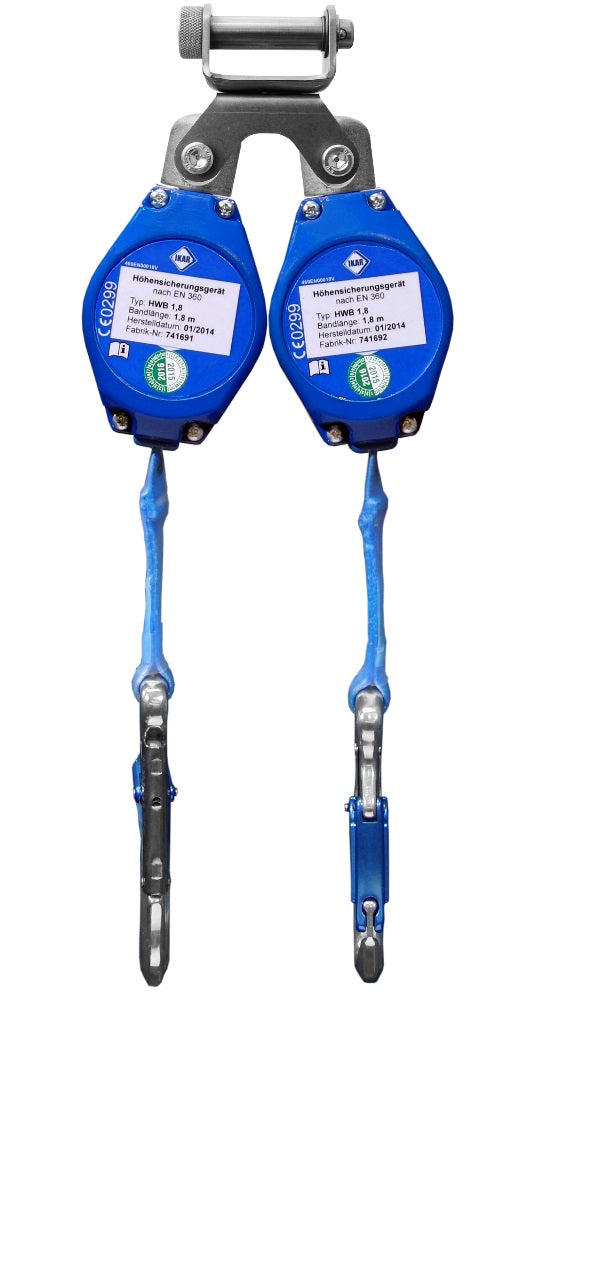 Widerstandsfähiges, wartungsarmes Höhensicherungsgerät mit Dyneema-Band und interner Falldämpfung. Das Doppelsicherungsgerät HWB DW ermöglicht wechselseitiges Anschlagen für einen gesicherten Arbeitsplatzwechsel im Rahmen der EU-Richtlinen89/686/EWG. Die Höhensicherungsgeräte sind für das Sichern in Hubarbeitsbühnen geprüft und zugelassen. Das Verbindungsmittel ist Doppelkanten geprüft.