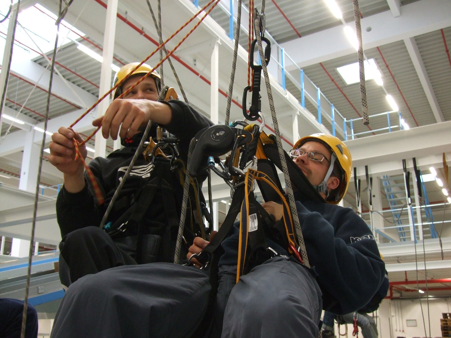 1. Tag Theoretische Grundlagen: Materialkunde, Materiallagerung, Normkunde, Regelwerke & Richtlinien, Sturzphysik. Im Anschluss erster Praxisblock mit Auf- und Abseiltechniken