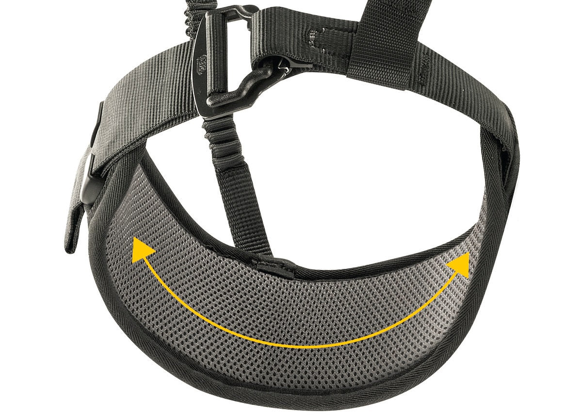 Er verfügt über einen halbstarren Hüftgurt und halbstarre Beinschlaufen, die den Komfort verbessern und Gewicht einsparen. Die selbstverriegelnden DoubleBack-Schnallen des Hüftgurtes und der Beinschlaufen sorgen für eine schnelle und einfache Einstellung. Die rückseitige Schnalle dient zum Befestigen eines TOP-Brustgurts.