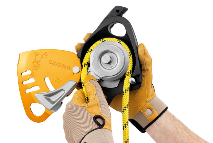 Dank der Markierungen auf dem Maestro lässt sich das Seil schnell und einfach einlegen. Der ergonomisch geformte Hebel und die integrierte Bremse ermöglichen eine komfortable Steuerung des Abseilvorgangs. Der Übergang von der Position "Ablassen" in die Position "Heben" erfolgt unmittelbar, ohne die Last verlagern zu müssen.