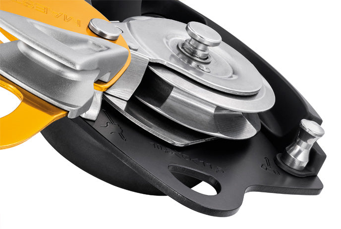 Die Abschrägungen der Laufrolle geben eine zusätzliche Kontaktfläche mit dem Seil und eine erhöhte Bremsreibung beim Abseilen/Ablassen von schweren Lasten. Die integrierte Umlenkrolle mit Rücklaufsperre und sehr große Laufrolle mit gekapseltem Kugellager lässt nur eine Laufrichtung zu und gewährleitet einen ausgezeichneten Wirkungsgrad beim Heben von Lasten.
