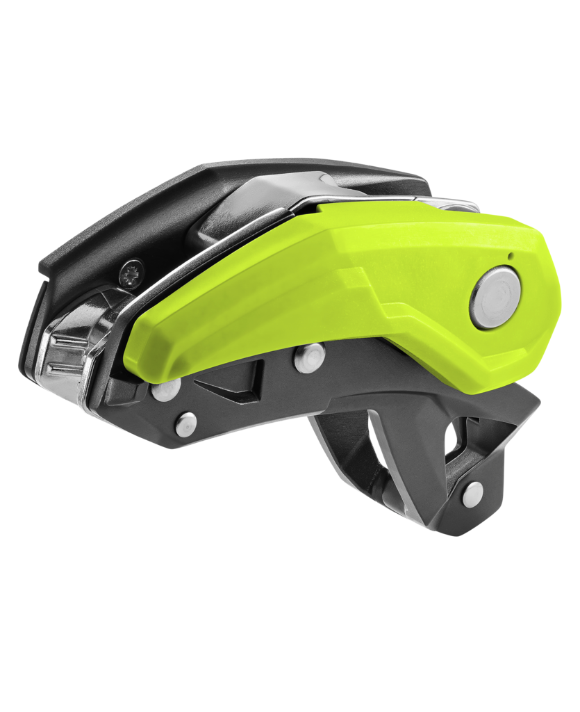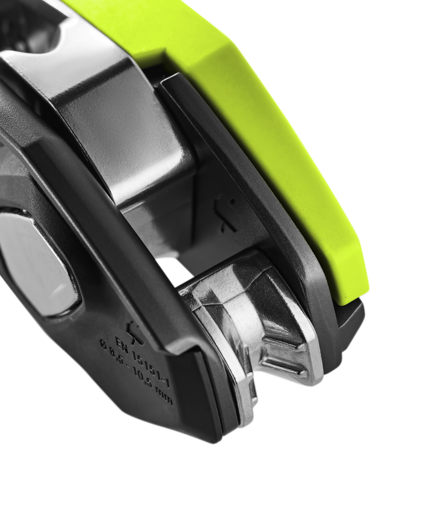 Zudem sorgt das kompakte Sicherungssystem für eine erhöhte Spannweite, mit der die sichernde Person 20 – 30 cm mehr Seil auf einmal ausgeben kann. Der lineare Seilverlauf durch die frontalen Bremsrillen aus Stahl reduziert Seilkrangel beim Ablassen und Abseilen. Dabei kann die Geschwindigkeit so zusätzlich zum Ablasshebel über den Druck der Bremshand gesteuert werden, was vor allem bei der Verwendung von dünnen, weichen Seilen zu einer erhöhten Bremsseilkontrolle beiträgt. Die Anti-Panik Funktion sorgt nicht nur bei Einsteiger*innen für ein Plus an Sicherheit.