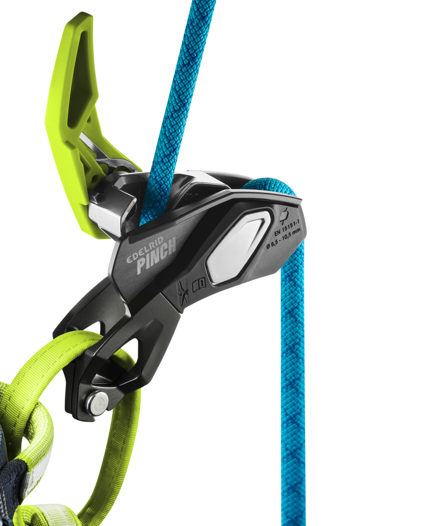 Ein neuartiges, vielseitiges Sicherungsgerät mit Blockierunterstützung für den Einsatz beim Sportklettern, in Mehrseillängen und in der Seilzugangstechnik: Pinch von Edelrid.