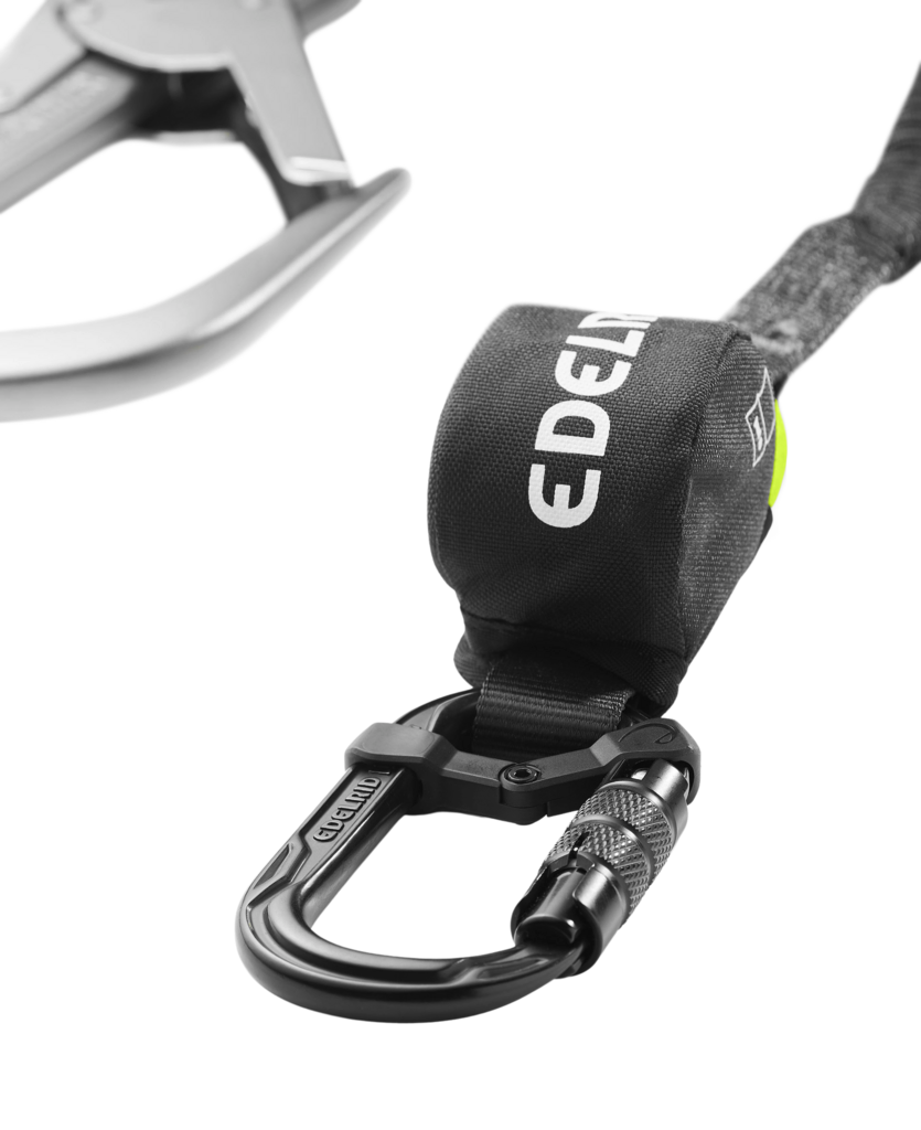 I-Verbindungsmittel mit elastischem Arm und DSG 2500 GIANT Handballenkarabiner. Die einfache Handhabung und große Öffnung des Karabiners machen das Set ideal für den Einsatz im Gerüstbau.