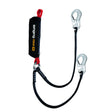 Der Y–Falldämpfer von Singing Rock mit 2x K370 Einhand-Karabinern. Die jeweiligen technischen Informationen und Identifikationen sind innerhalb des textilen Schutzes, der den Falldämpfer ummantelt, zu finden.