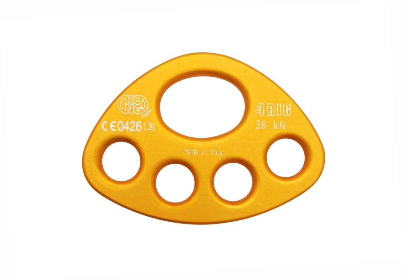 Die 4Rig von Kong ist eine kompakte Riggingplatte mit 4 abgeschrägten, hochfesten Löchern (Ø 20 mm) für übersichtliches Arbeiten und den Einsatz in komplexen Riggingsystemen mit mehreren Anschlagpunkten.